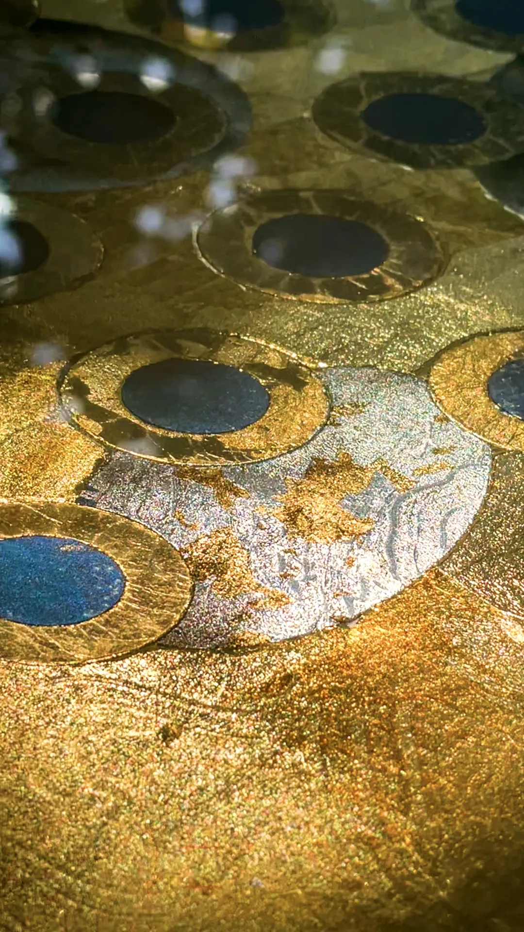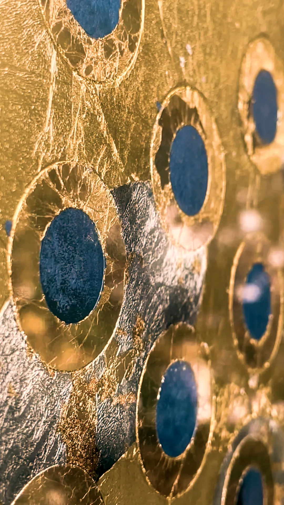 Crafted from a medley of gold leaf, metal leaves, vibrant colors, and curvilinear patterns, these elements come together to exude movement and gesture, reflecting the artistry and meticulous craftsmanship behind its creation.