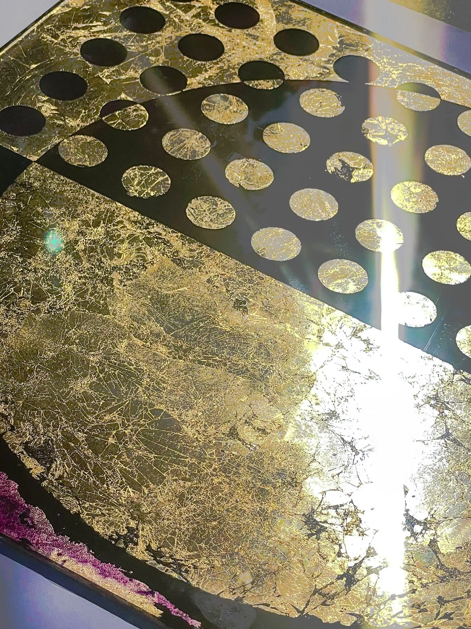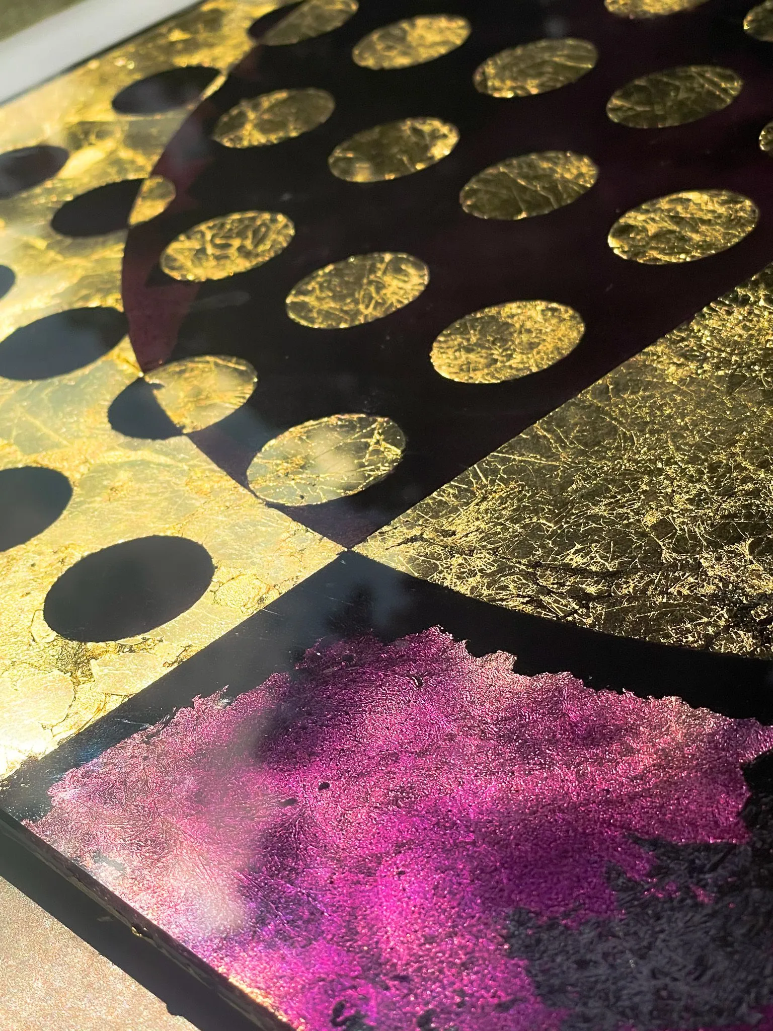 Bold magenta contrasts with gold leaf, creating whimsical shadows and dramatic depth in a balanced, symmetrical dance of light and dark.Crafted from a medley of gold leaf and vibrant colours, these elements come together to exude movement and gesture, reflecting the artistry and craftsmanship behind its creation.