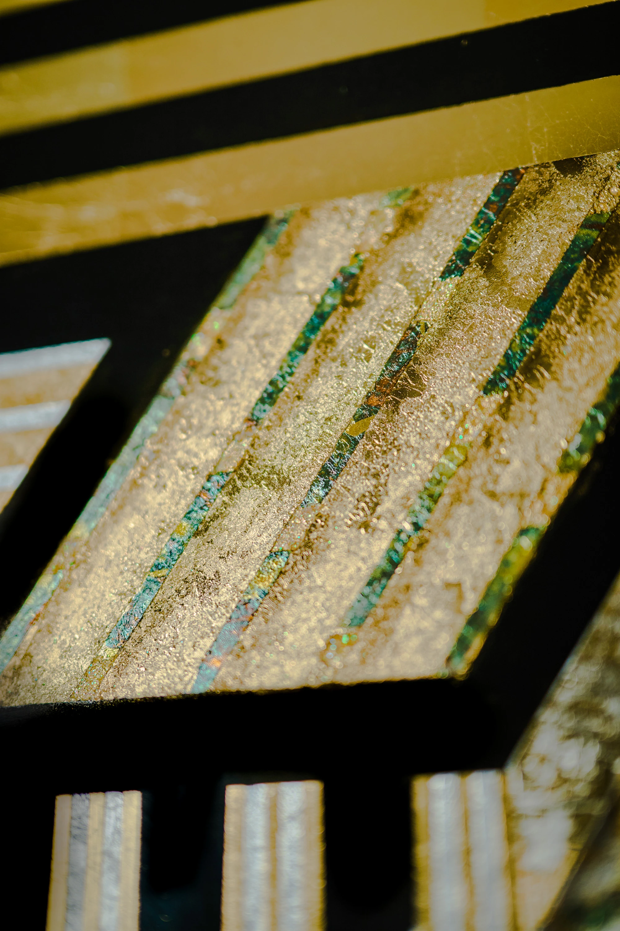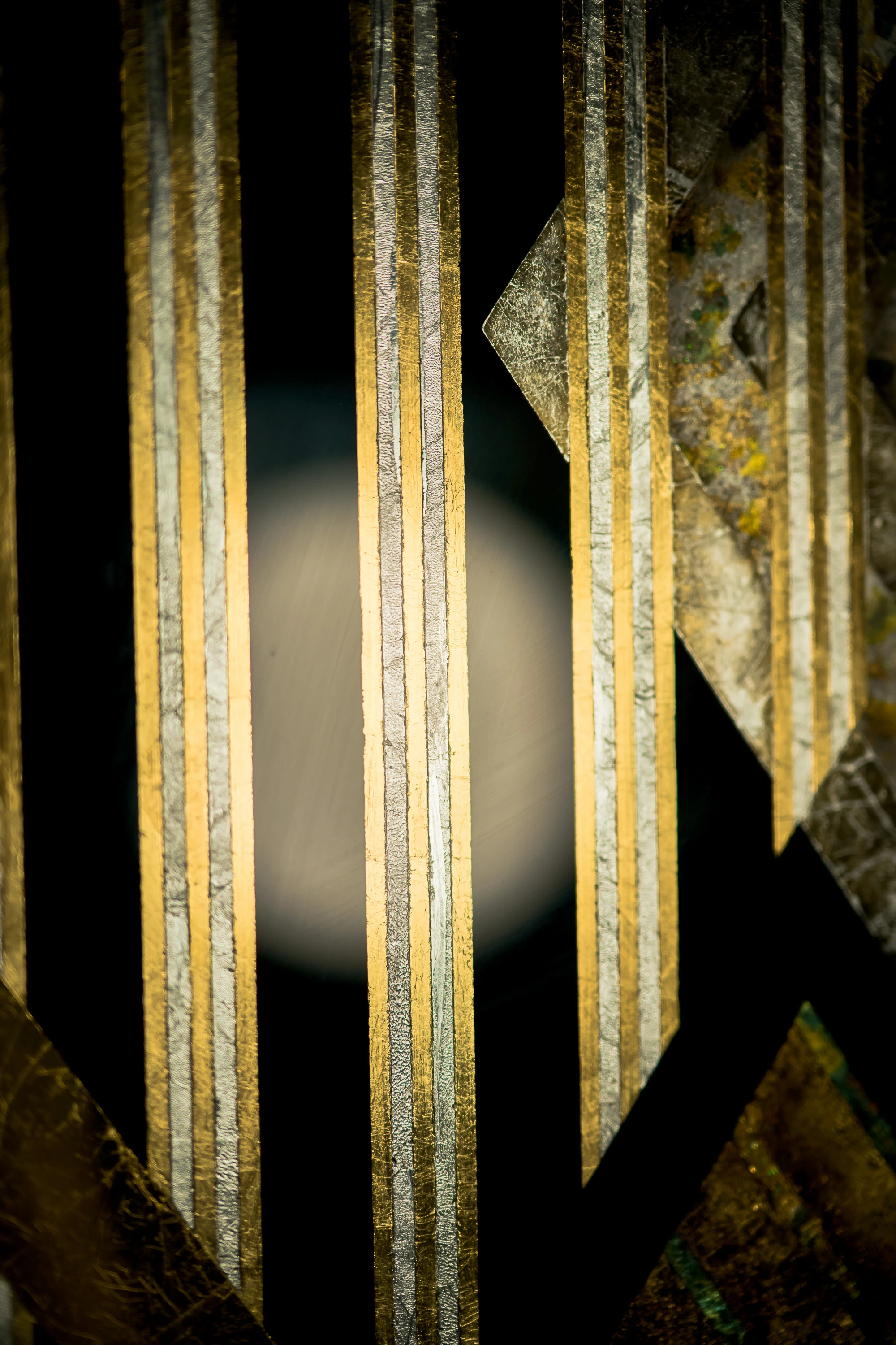 Bold diagonals and converging verticals suggest upward movement, with parallel striations in contrasting metals creating geometric tension and luminous interplay. Reverse-gilded gold, silver, and mixed metal leaf hand-etched linework on glass.