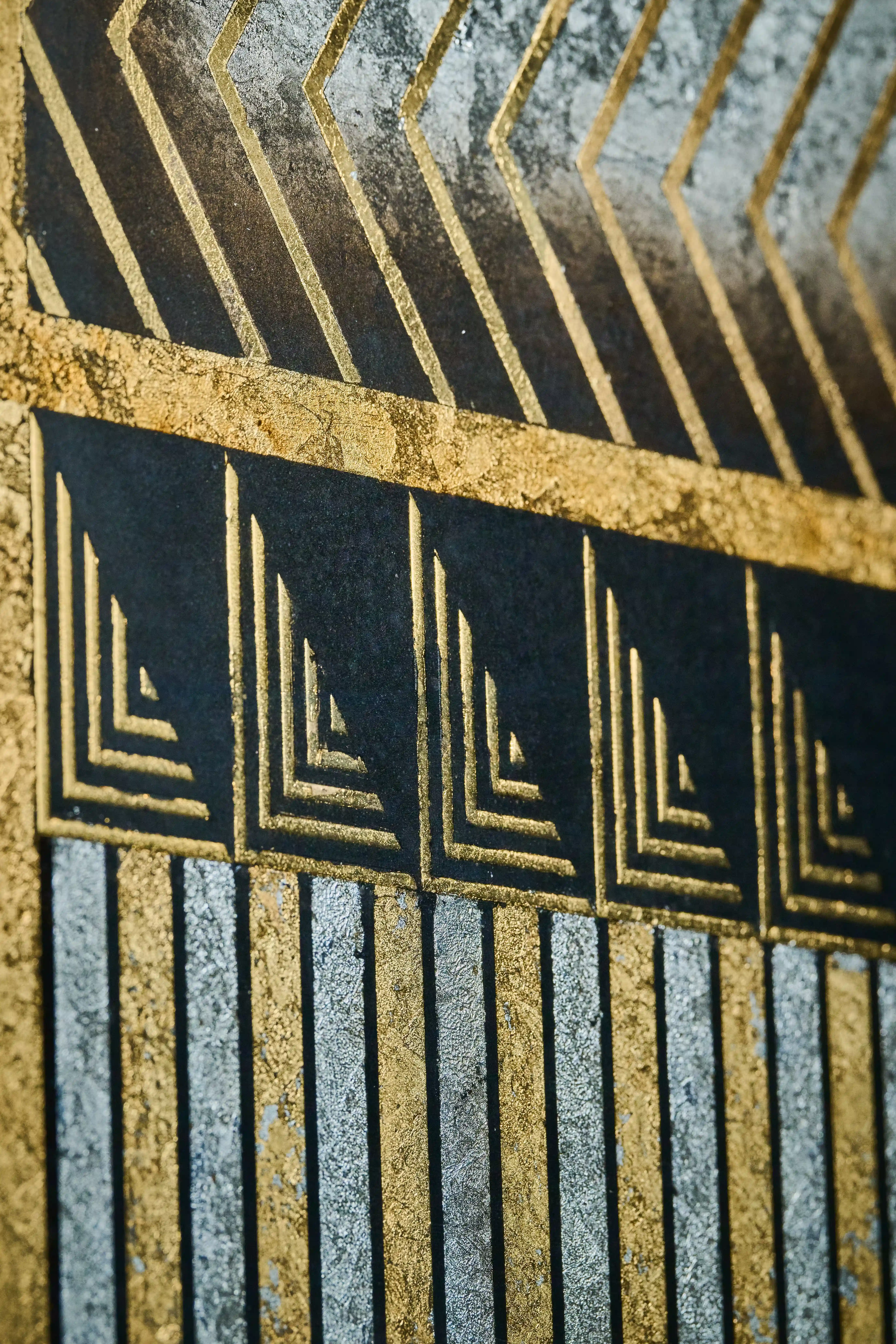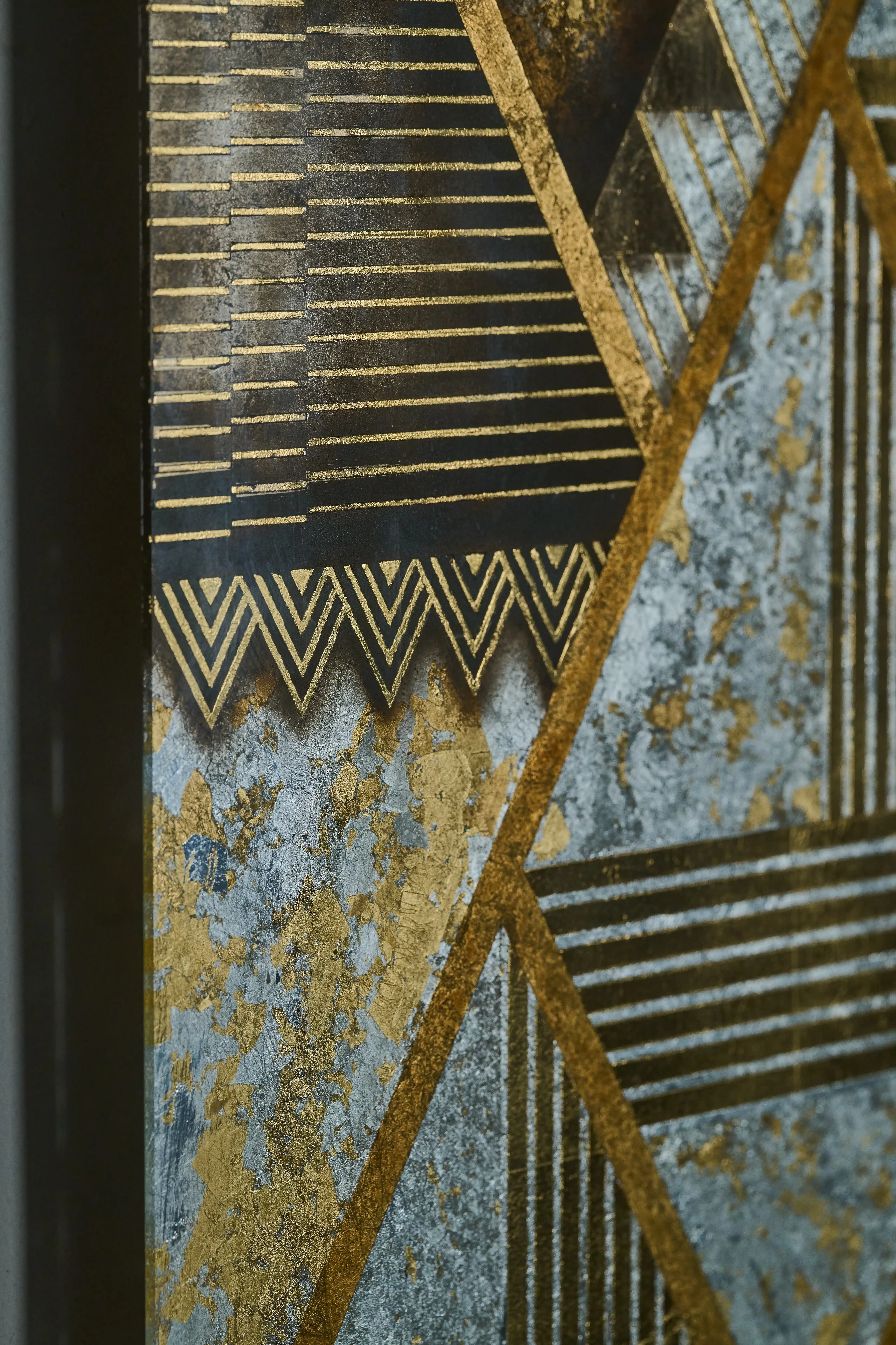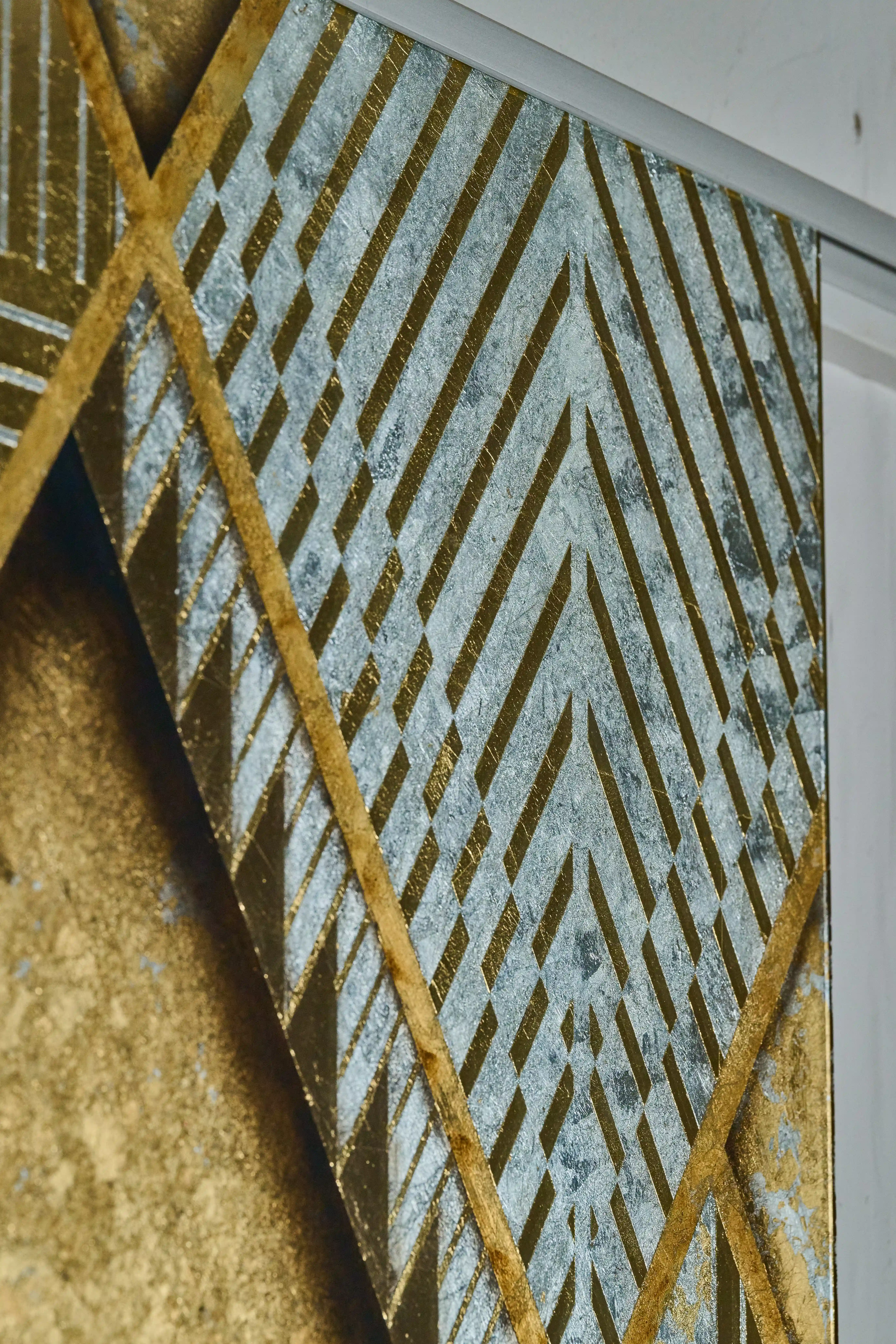 Graduated line weights and angular composition create visual rhythm, with layered metallics revealing subtle tonal shifts as light and perspective change. Reverse-gilded 23k gold, silver, and mixed metal leaf hand-etched linework on glass.